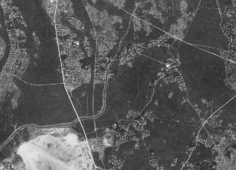 太平洋戦争が終わって間もない1947年8月27日に米軍により撮影されたものです。当時の牛山町の住宅分布状況がよく分かります。この当時は、林や森もまだ沢山残っていました。