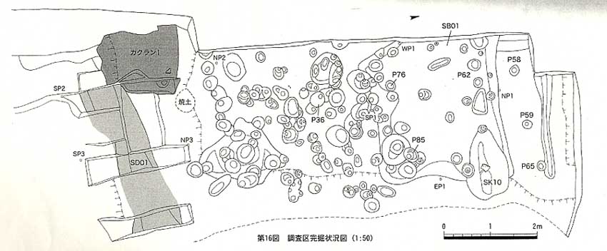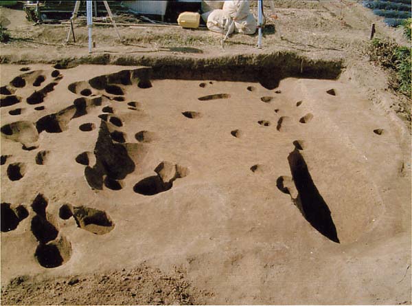 ・SBO1 調査区の北側半分で1辺2.9m×2.6mの長方形を呈する竪穴住居を検出した。埋土は暗褐色土、黄褐色土(暗褐色土粘土混じり)。P62、P76、P85は住居主柱穴と考えられ、径20〜30cm、深さ9〜19cm、柱間は1.8m×1.6mである。南壁面及び東壁面中央付近で地山が突出している。 北東コーナー付近で炭化物、焼土ブロックを多く検出したが、カマドに伴う遺構は確認できなかった。 出土遺物は細片が多く、図化できるものがほとんどないが、須恵器坏・蓋、灰釉陶器碗、土師器甕がある。9世紀後半頃であると考えられる。 ・SK10 SBOl完掘後、住居の床面で検出した。長径150cm×短径80cm、深さ54.7cmを測る。埋土は暗褐色粘質土。須恵器甕の底部、土師器甕片等が出土している。 また、石鏃が1点土坑内から出土した。チャート系の石材で、縄文時代のものと考えられる。池田川を挟んだ西側の北外山東浦遺跡(小牧市)でも縄文時代(島崎皿式)の遺構が検出されており、縄文時代の遺構の存在が示唆される。