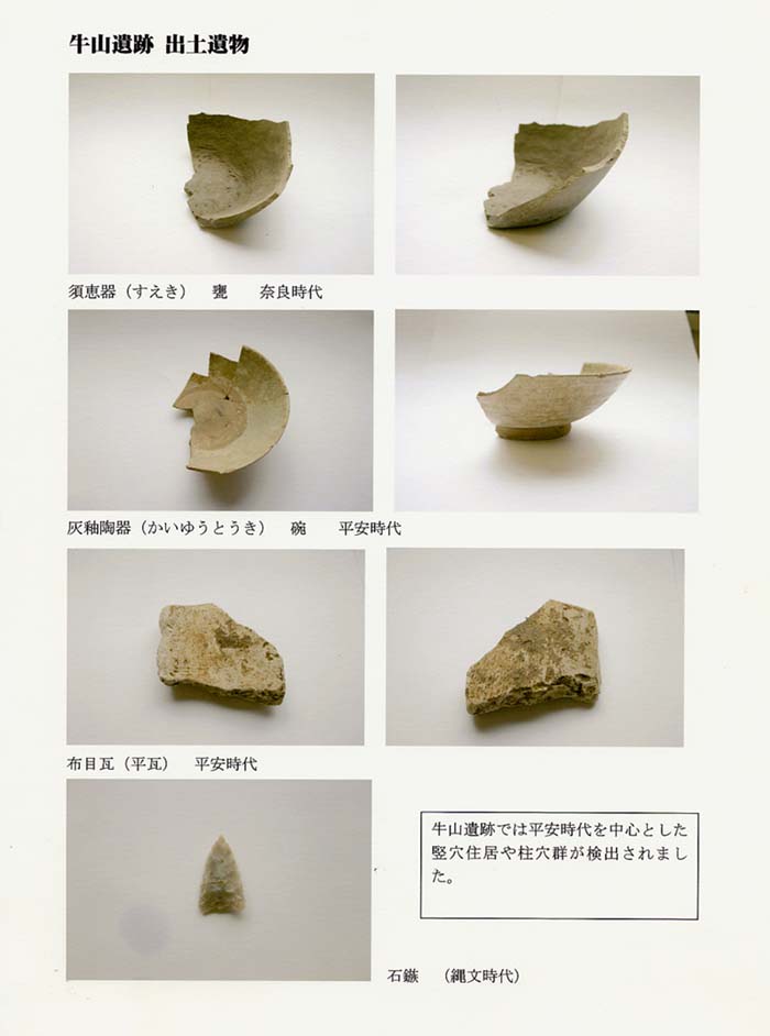 136基のピットを検出した。ピットは深いもので75cm、多くのものが深さIOcm〜30cmほどで、いくつか切り合っている。ほとんどのピットで時期を確定できるような出土遺物がなく、土師器や灰釉陶器、山茶碗の細片に留まる。概ね平安時代〜中世であると考えられる。 調査区北端で検出したP58、P59、P65は柵列を構成する。径20cm、深さ15〜20cmで、柱間は120cm、100cmである。出土遺物がなく、時期は不明であるが、竪穴住居軸方向とほぼ平行している。 P36からはこぶし大の赤く焼けた円礫と焼土塊が出土している。 ・カクラン01・SDO2(牛山第1号窯について) 高台南斜面で1.4m×lm以上の方形の土坑から大量の炭化物と焼土塊、布目瓦が出土した。瓦は1枚作りの平瓦で縄目叩きが施されている。瓦窯の推定地であったことから、窯に関連する施設との期待もあったが、トレンチによる断ち割りの状況から後世の撹乱であることが判明した(カクランOl)。 窯の痕跡を確認するため、南斜面にトレンチを設定し、東西に走る溝を1条確認した(SD02〜)。SD02〜は、高台に平行して東西に地山を大きく削っている。形態上SDとしたが、埋土中から現代の瓦が出土しており、流水や耐水した痕跡が見られないことから、溝状に掘られた撹乱であると判断される。炭化物や窯壁の残痕が埋土中に堆積しており、上位に窯体があった可能性が考えられるが、窯の規模、方向性などは不明である。 ・昭和57年現地踏査出土遺物について 灰釉陶器の碗1点と玉縁式の丸瓦、平瓦を検出している。灰釉陶器は、径17.lcm、器高6.2cmで薄緑色の灰釉がかかる。約3分の2が残存。口縁部に輪花が施されている。