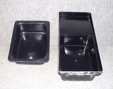 | 左、FRP製シンク平、黒ゲル仕上 240X330 T100 ゴム栓付き \10000 右、FRPシンク大、黒ゲル仕上 490X220 T140 立ち上げ部分30mm自作に便利な 形状です。ゴム栓付き \12000 受注製作品 |