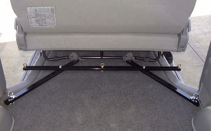 | 新型ハイエース用タイダウンサポート 販売終了いたしました。 タイダウン位置を42cm前方と中心に設ける キット。構造的にタイヤストッパの位置決めも できます。受注生産品。 アイボルト3個付属、純正アイボルトもすぐ 横に取りつけられます。S-GL用 \12000- |