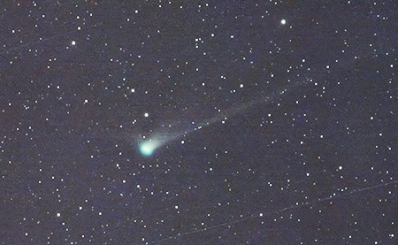 ラブジョイ彗星が天の川の中を北上しています。明るさは8等くらい。7×50双眼鏡ではそこにいるのかな〜という程度。正直よくわかりませんでした。写真に撮ると、尾はありませんが、青緑色に写ってその存在はすぐにわかります。