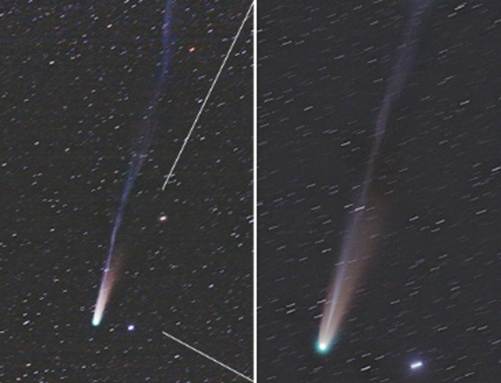夕方の西空に回ったレモン彗星が4等です。双眼鏡で1.5°くらいの尾が見えましたが、肉眼ではわかりませんでした。写真ではイオンの尾が10°以上、画角からはみ出ました。