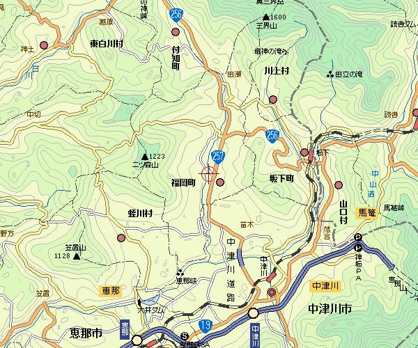 下記地図の「長根」というところにある福岡郵便局の道路の反対側が当社です。国道257号線を下呂方面に進んで右側です。 左は大きなドライブインと本屋です。 地図上の中津川信組の場所は、現在岐阜信用金庫です。